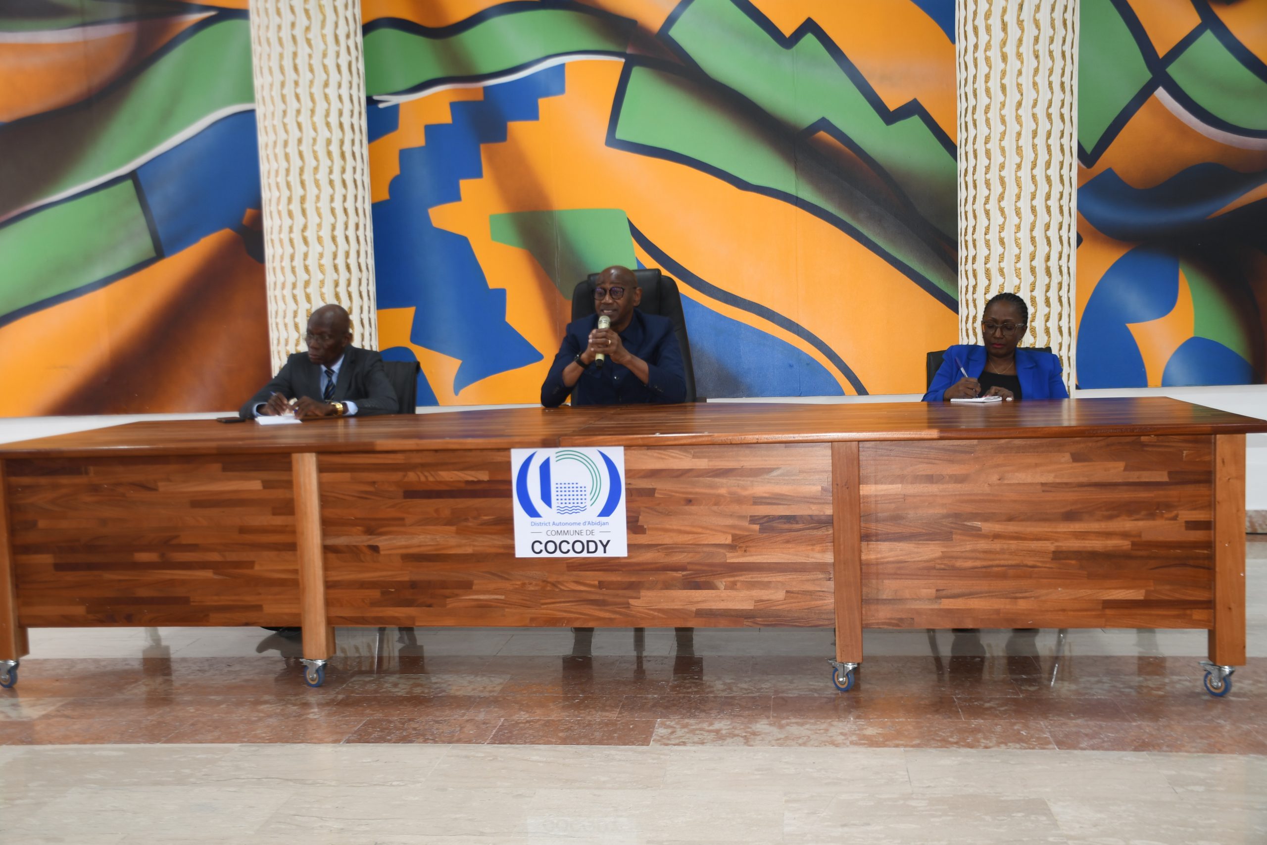 2- Mot de bienvenue adressé par Monsieur Daniel Joseph N’GUESSAN, 5e Adjoint au Maire, au nom du Maire Jean-Marc YACE. Il avait à ses côtés, le Secrétaire Général de la mairie, Doh OULAÏ et Madame Rosine N’GUESSAN ELUH, Directrice de l’Éducation, des Affaires Sociales et Sanitaires.